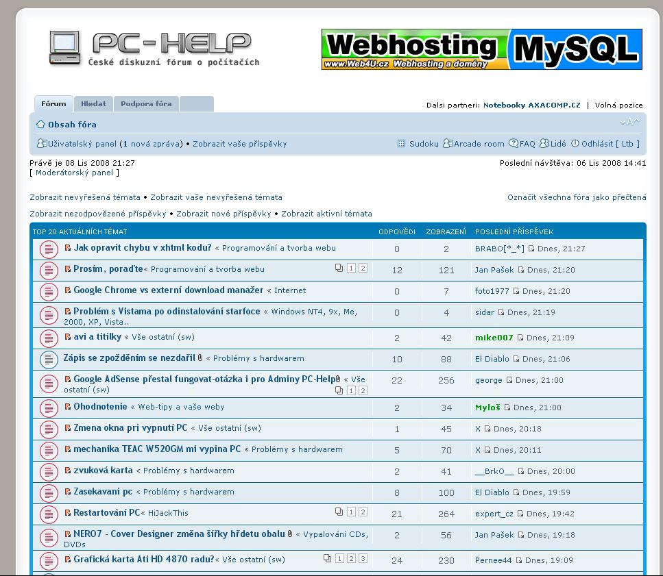 Ještě technická podle toho jak se to zobrazuje mě. bordel v tom dělá kolonka poslední příspěvek záleží hodně na počtu znaků v nicku posledního odpovídajícího. datum pokud jde uvádět celé v číselné formě DD,MM,YYYY čas pokud to jde 24 hodinový režim. Tím bys ušetřil další 3 znaky než se řádek zalomí.