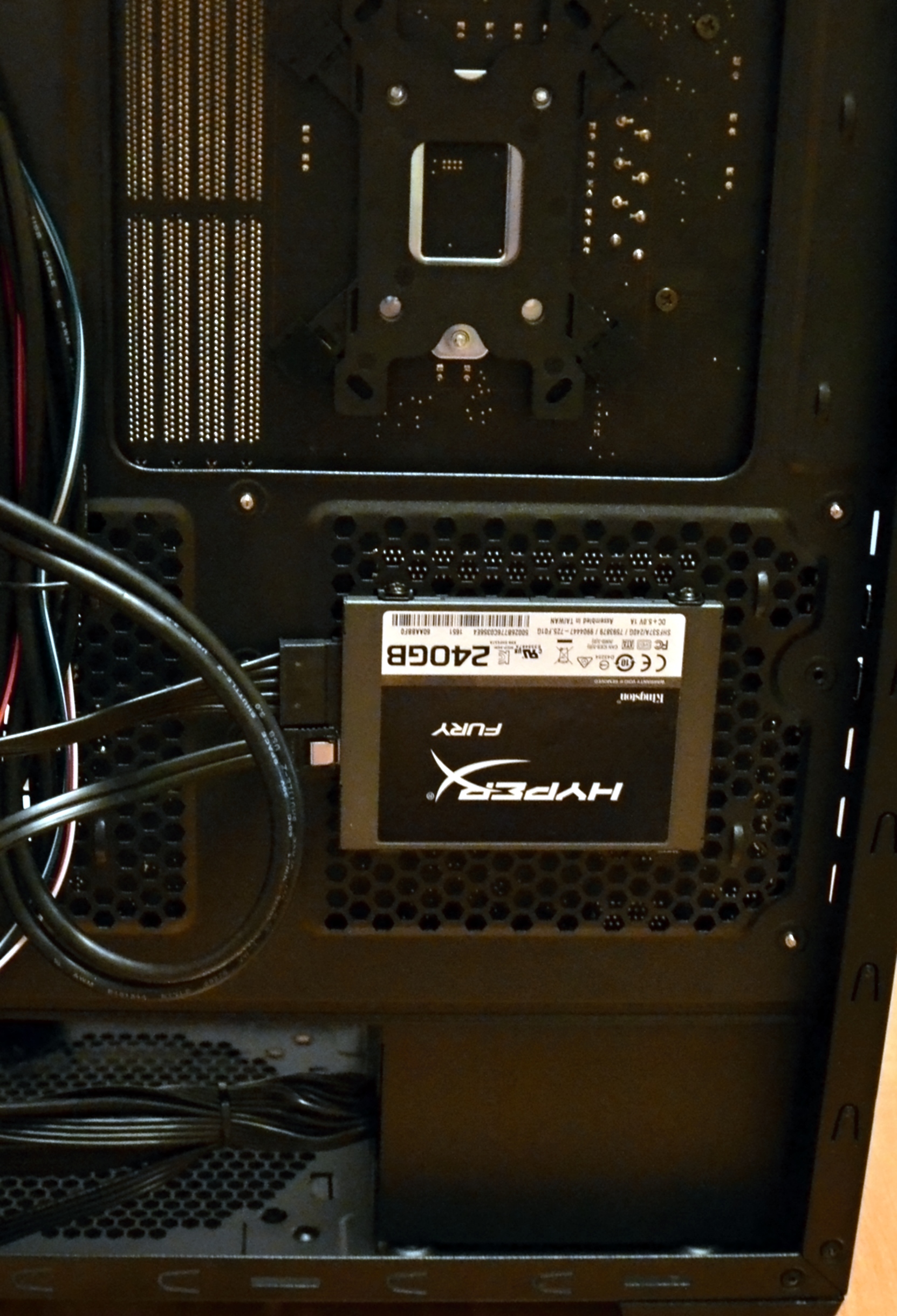 SSD disk : Kingston HyperX Fury 240GB - Prověřená volba,solidní rychlosti zápisu i čtení a k tomu dobrá cena - to byly hlavní vlastnosti,proč zrovna tenhle disk. Pokud ho na obrázku v case nevidíte,tak je to tím,že je namontovaný ze zadní strany skříně v místě pod základní deskou.
