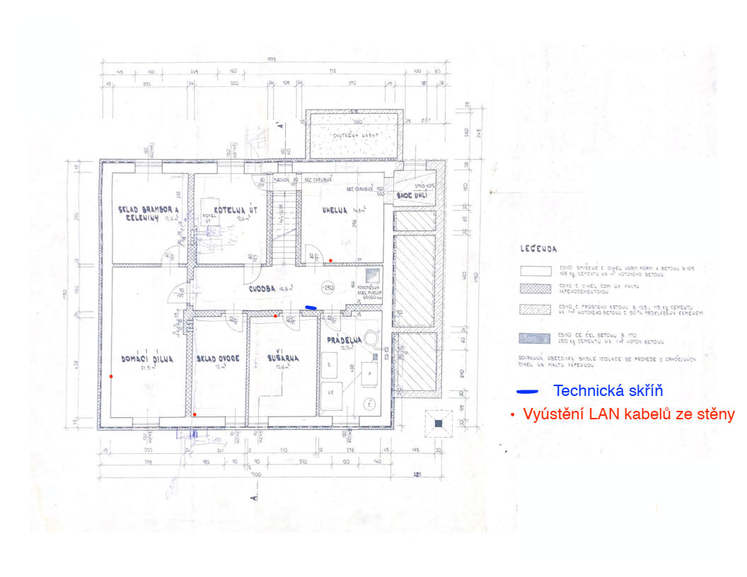 Už jsou natažené 4 kabely ve stěnách. Jejich vyústění je viz obrázek červená tečka. Začínají ve skříni na chodbě ve skříni (na obrázku znázorněná modrá čára).