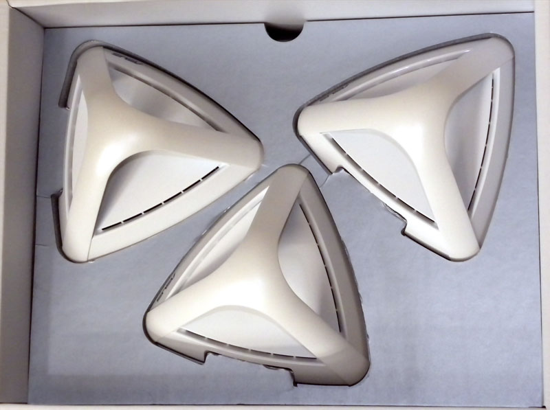 V krabici najdete tři satelity, tři zdroje a kabel RJ45 pro připojení k vašemu routeru, či modemu. Dále je přiložen jednoduchý návod (čeština nechybí). Zajímavý, pyramidový tvar satelitů není jen designerským nápadem, ale v hranách pyramid jsou umístěny tři antény. Tím je zároveň zajištěno jejich optimální nastavení.