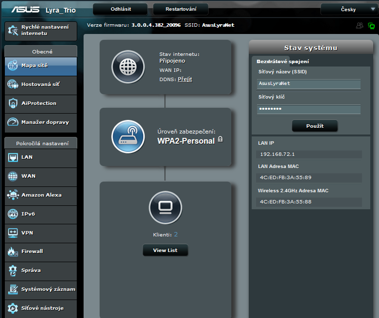 Primární satelit funguje jako router a zadáním jeho IP adresy vyvoláte známé rozhraní z routerů Asus:Zde najdete všemožná nastavení, mimo jiné možnost hostované sítě, QoS, LAN, VPN, Firewallu. A samozřejmě nástroje pro správu.