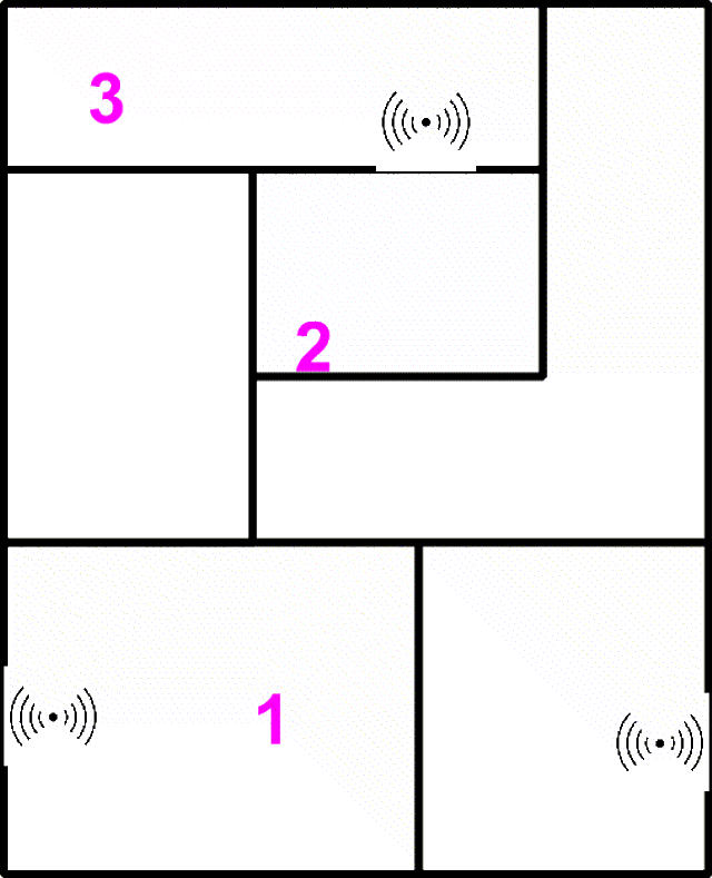 Nemám žádnou metodu jak testovat mesh WiFi, tak jsem jednoduše rozmístil satelity po bytě a na různých místech jsem zkoušel propustnost sítě. Na plánku je nákres rozmístěných satelitů a měřící místa jsou označena čísly. K testování byl použit notebook, jehož WiFi karta umí obě pásma. Kromě toho je v místě č.3 stolní počítač, ve kterém je instalována WiFi karta Asus PCE-AC68.