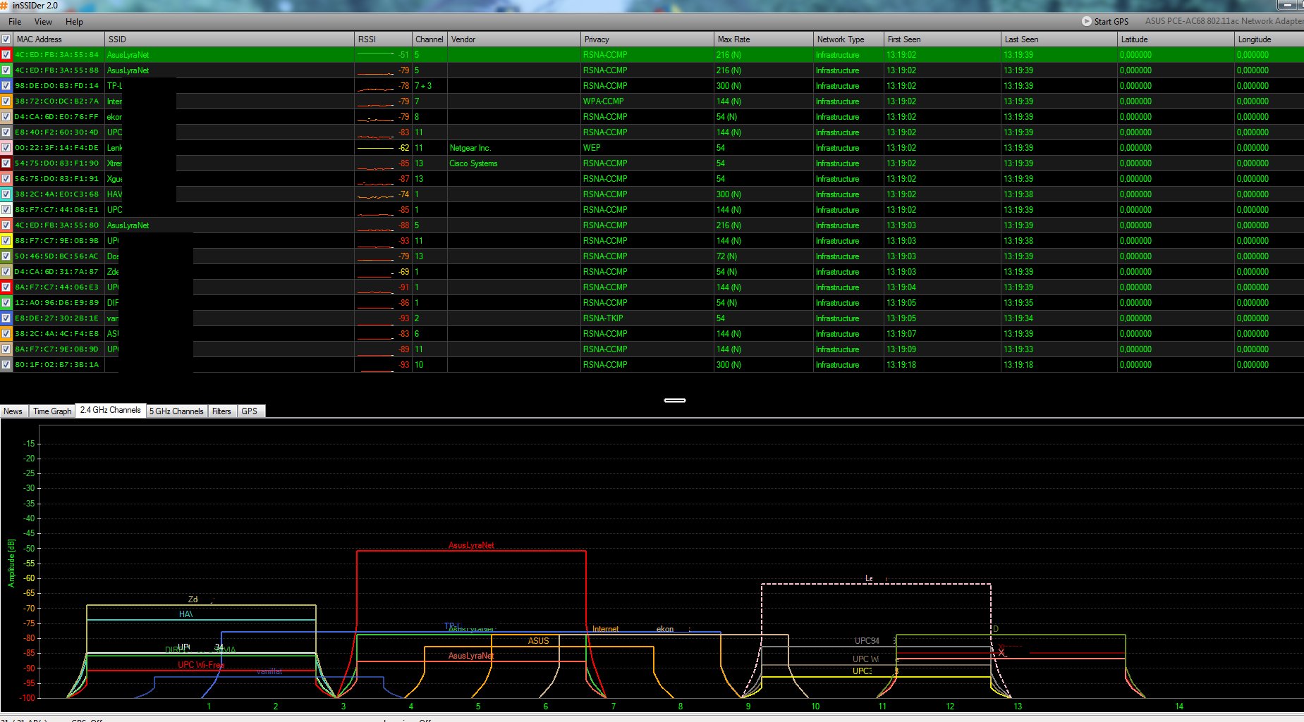 A pro zajímavost ještě přidám screen z programu InSSIDer, zde můžete vidět s jakým zarušením se musela Lyra vyrovnat.