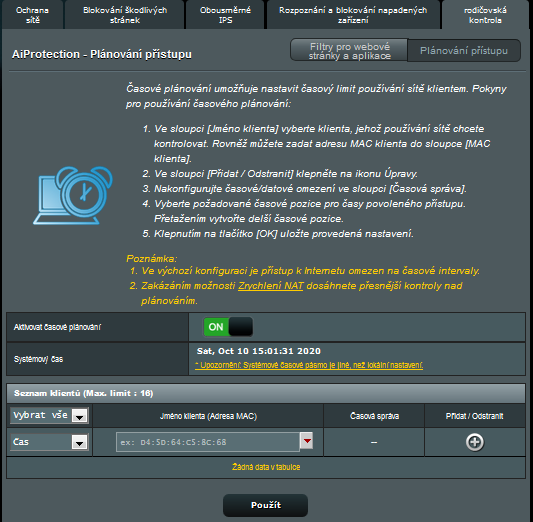 Rodičovská kontrola umožňuje omezit přístup k určitým internetovým stránkám a časové omezení přístupu k internetu. Stačí zadat MAC adresu určeného zařízení.