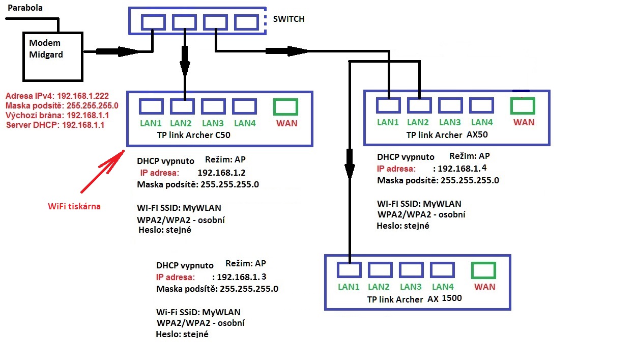 Riki: chápu to správně, že ten switch vyhodím a místo něj jiný router v režimu AP s vypnutým DHCP, pro Wifi síť zadám stejné parametry jako na ostaních routerech, abych měl pořád jednu stejnou síť (název sítě, heslo)?