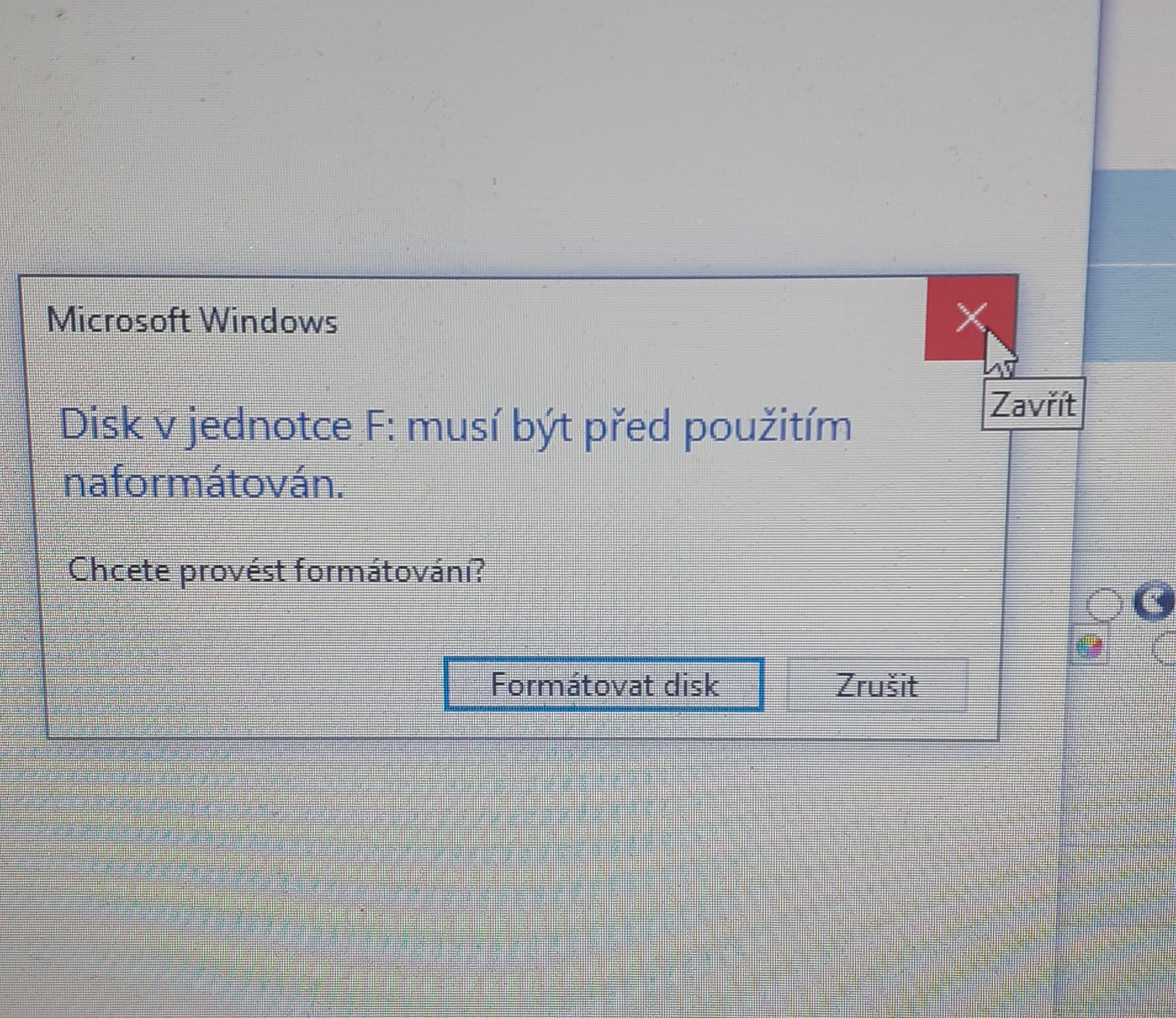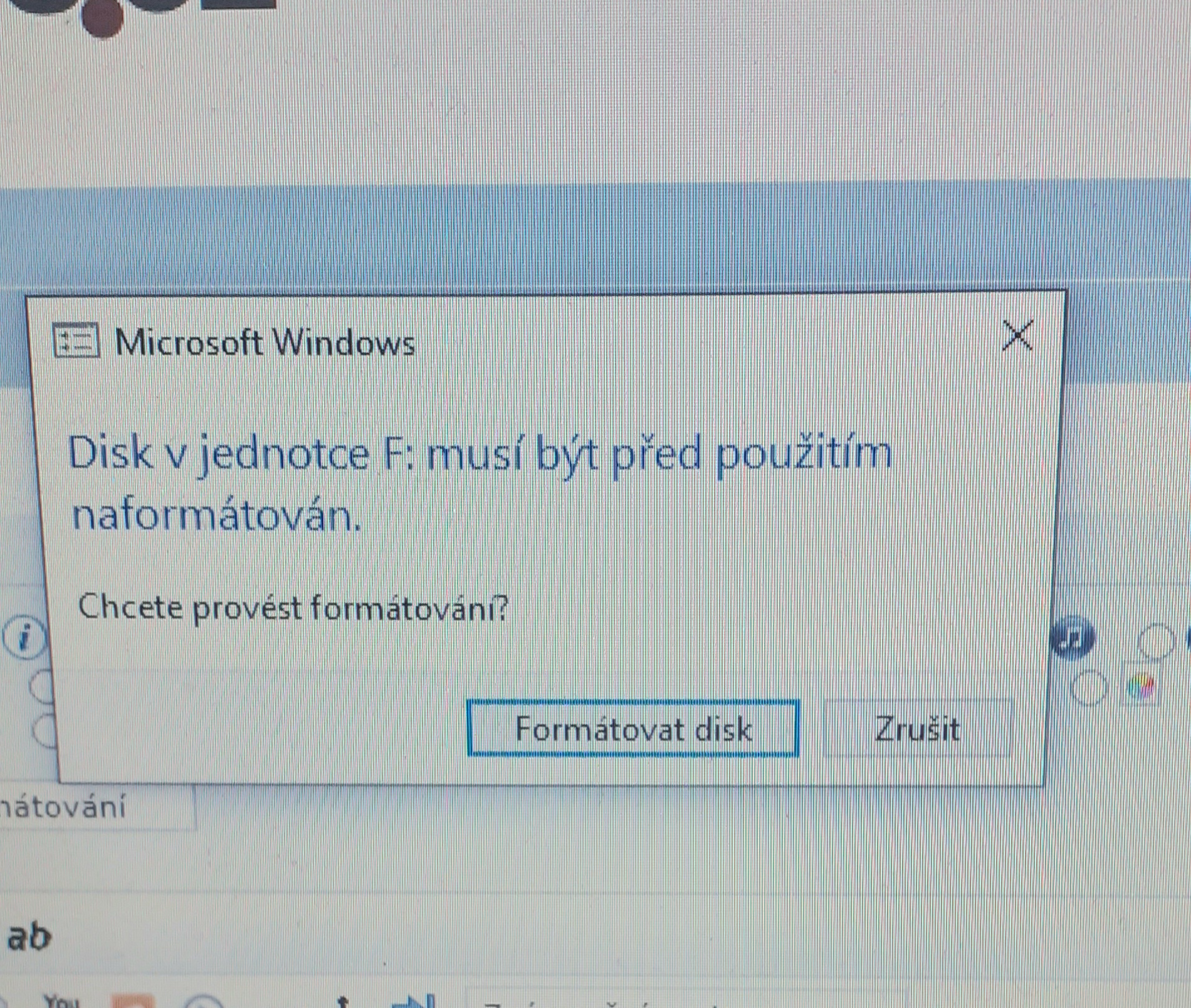 poradil by někdo jak vyřešit problém z USB flash diskem, který po připojení k NTB hlásí, že je třeba ho naformátovat, konkrétně to píše: "Disk v jednotce F: musí být před použitím naformátován" ? Po načtení neukazuje žádná data.