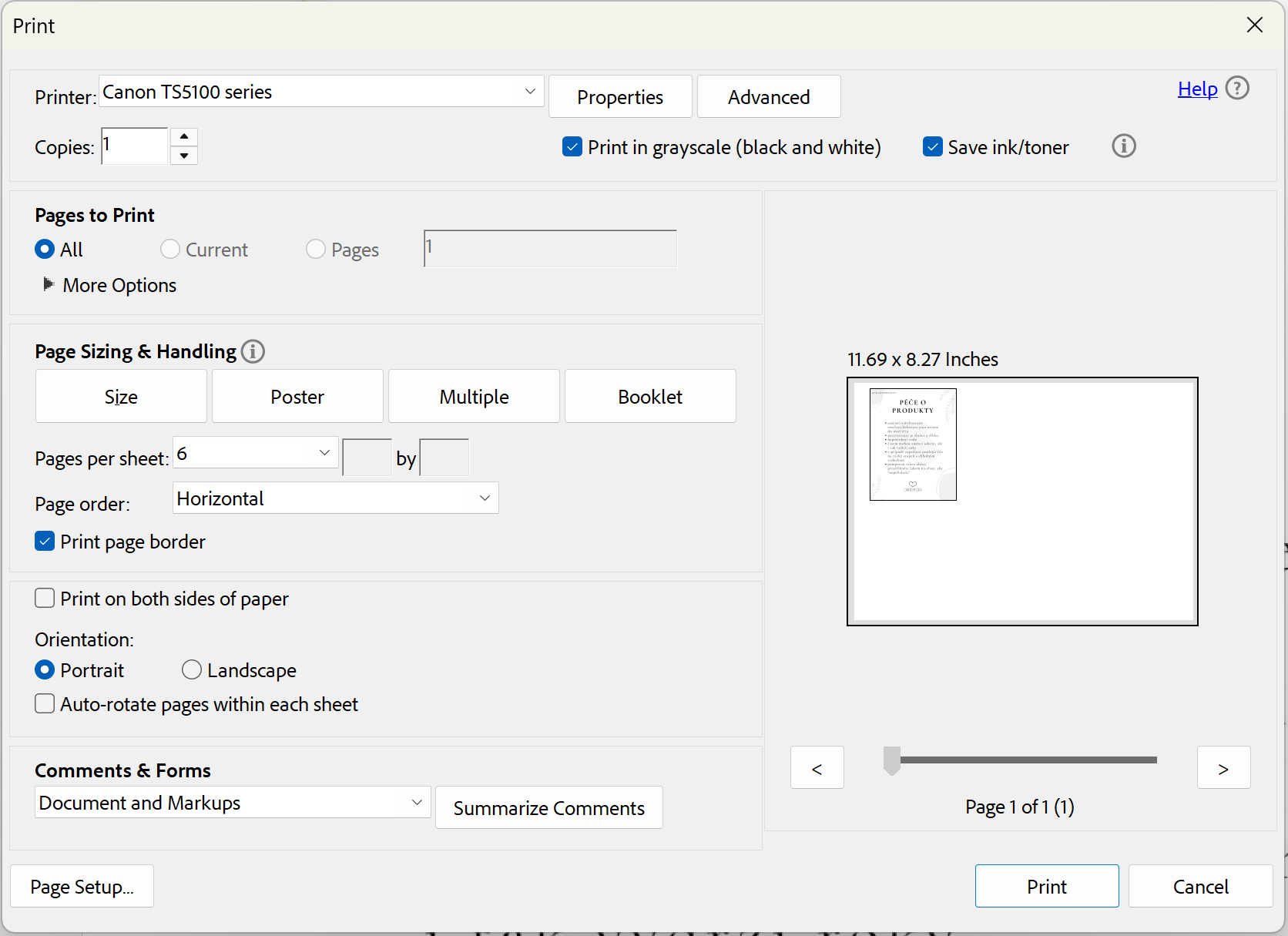Ahoj, před pár dny jsem si koupil tuto tiskárnu (Canon Pixma TS5150) a funguje skvěle. Mám ale jeden malý problém s tiskem více stránek na jeden list ve Windows 11. Na jiném zařízení (Mac) to funguje bez problémů… Problém je jen ve Windows – když zvolím tisk více stránek na jeden list, obsah se v náhledu správně zmenší (například při volbě 4 stránek na list to zmenší náhled na čtvrtinu papíru, což je v pořádku), ale při samotném tisku se vytiskne jen jedna stránka z náhledu, ne všechny.