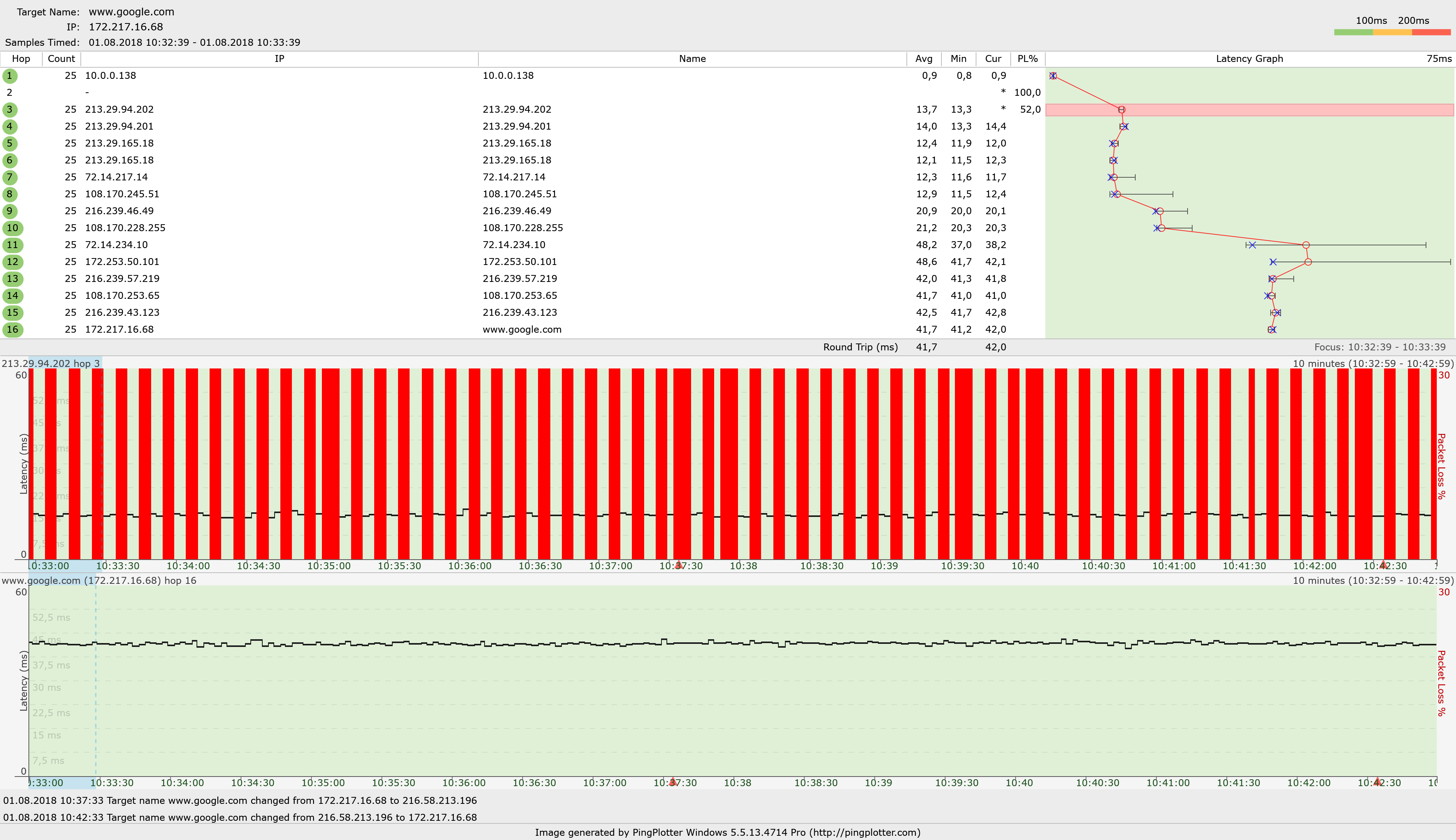 Spustil jsem program PingPlotter a tam jsem zjistil, že hned u 3 hopu je výpadek.