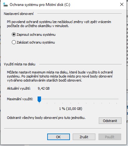 Koľko % máš vyhradené na disku pre body obnovenia?