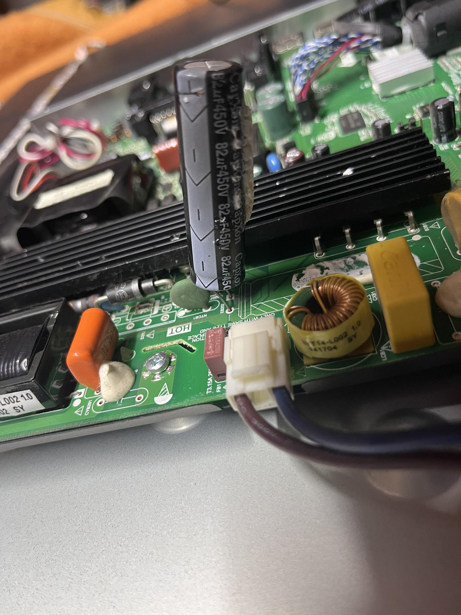 To je hned u fáze zdrojového kabelu. Tím pádem nevím jestli kdyby tento kondík byl KO, tak by nesvítila ani modrá červená / modrá dioda k zapnutí / vypnutí ne? Zvedl jsem ho pro lepší fotku: