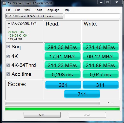 Mám tuhle sestavu: http://www.alfacomp.cz/php/basket.php?i ... 53011KB101 akorát místo SSD Vertex, mám Agility 4 128GB a v benchmarku mám čtení maximálně 176.3 MB/s a to se mi zdá málo, když má čtení: až 400 MB/s – čekal bych tedy v realu až 350 MB/s.