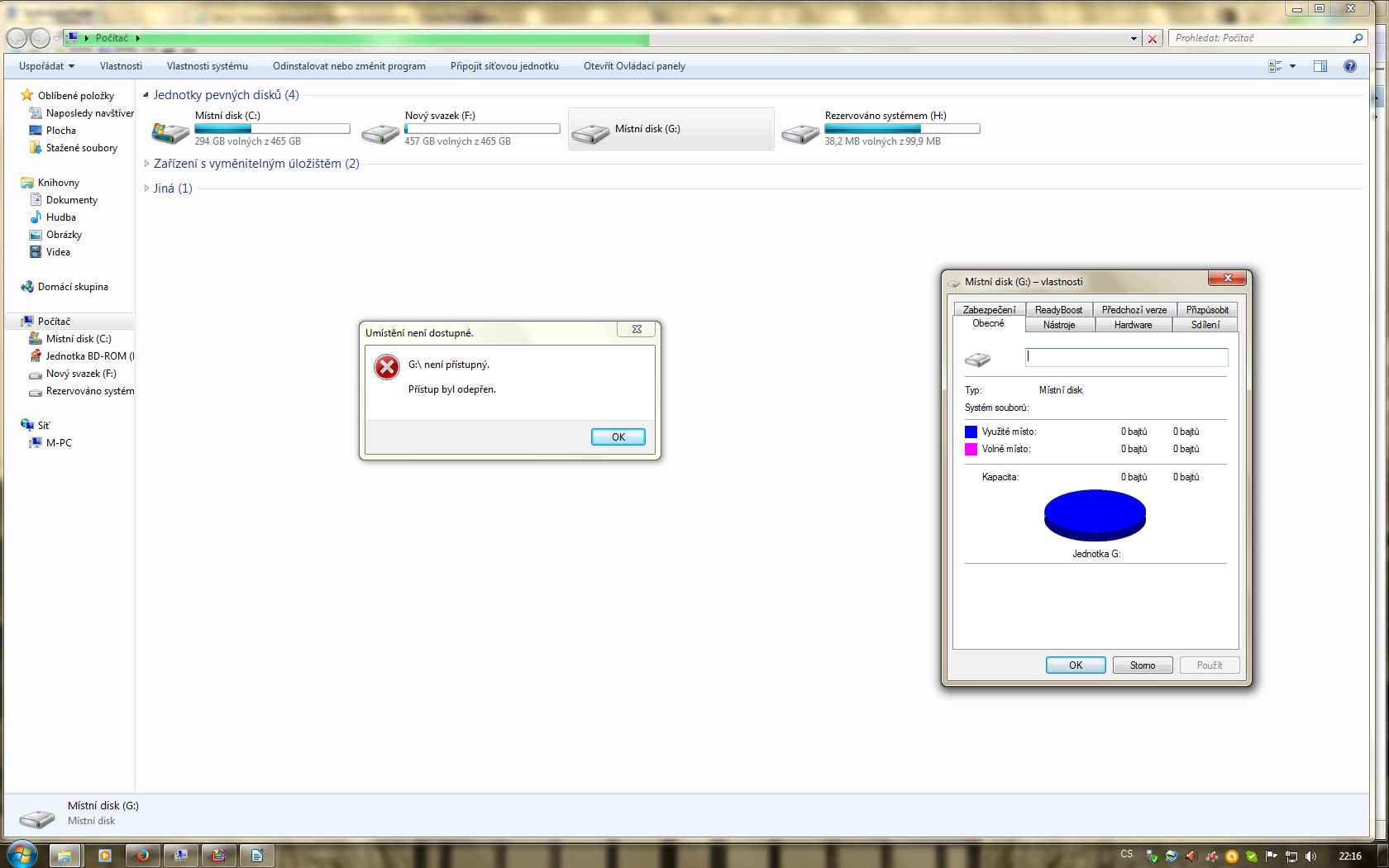 Vzal jsem od kamaráda HDD, bylo v něm spousta breberek a nenačítal mu Win7. Antivirem jsem odstranil asi 35 závažných nákaz, ale chtěl jsem se do něj dostat a vymazat sajrajt, co tam jeho klučík natahal. Leč po připojení do mého PC přes USB dok se se mě zobrazí se dvěma oddíly a to jako H:rezervováno systémem 100MB aktivní, volných 38MB, ale žádná data na něm. Druhý oddíl je G: uveden jako místní disk, ve vlastnostech se zobrazuje jako zaplněn ale velikost 0,volné místo 0, při pokusu o otevření je nepřístupný. Ve správci počítače je označen jako primární oddíl 465GB.