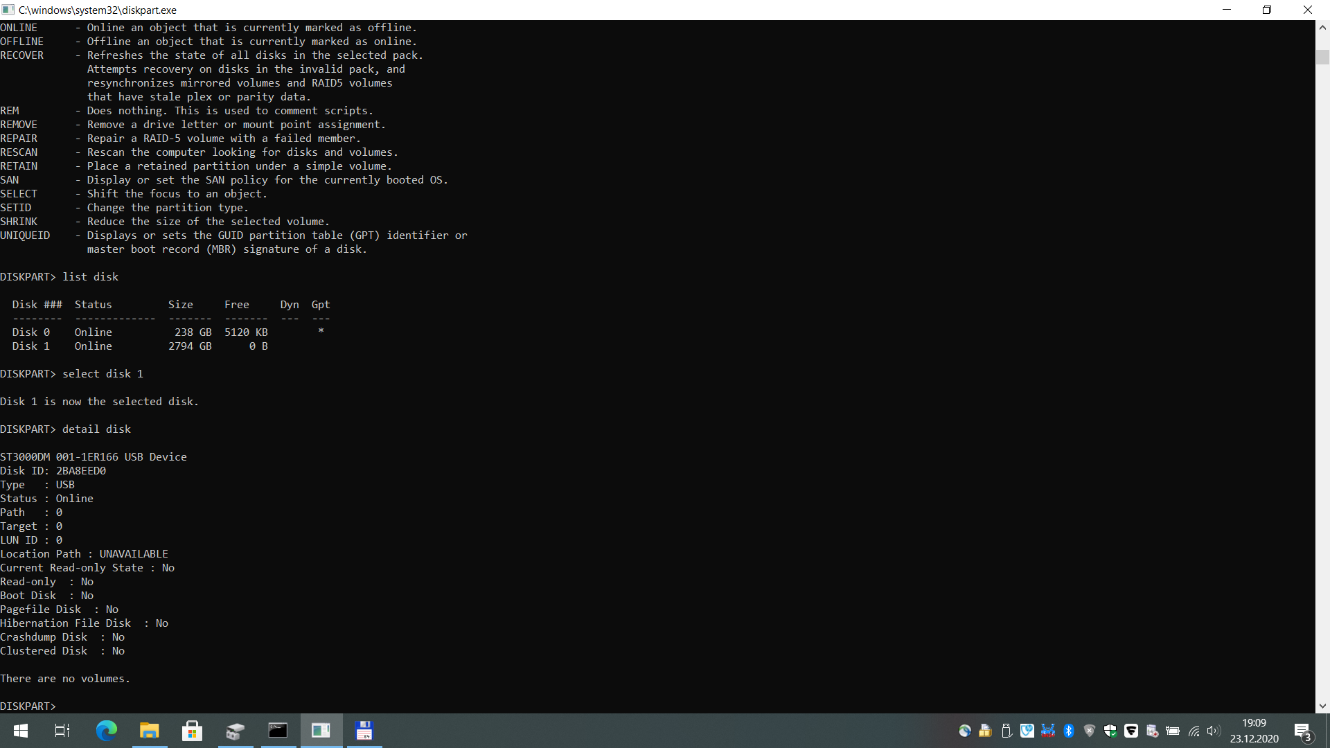 3TB disk na data, podle správce disků je online, ukazuje však nějakou velikost okolo 16TB. Nicméně v diskpartu jsem dohledal opravdu skutečnou velikost onoho disku. Problém je, že systém vůbec nevidí svazek. Na disku by měla být data snad v pořádku, alespoň podle skutečnosti, že nedávno ještě šel-nešel.