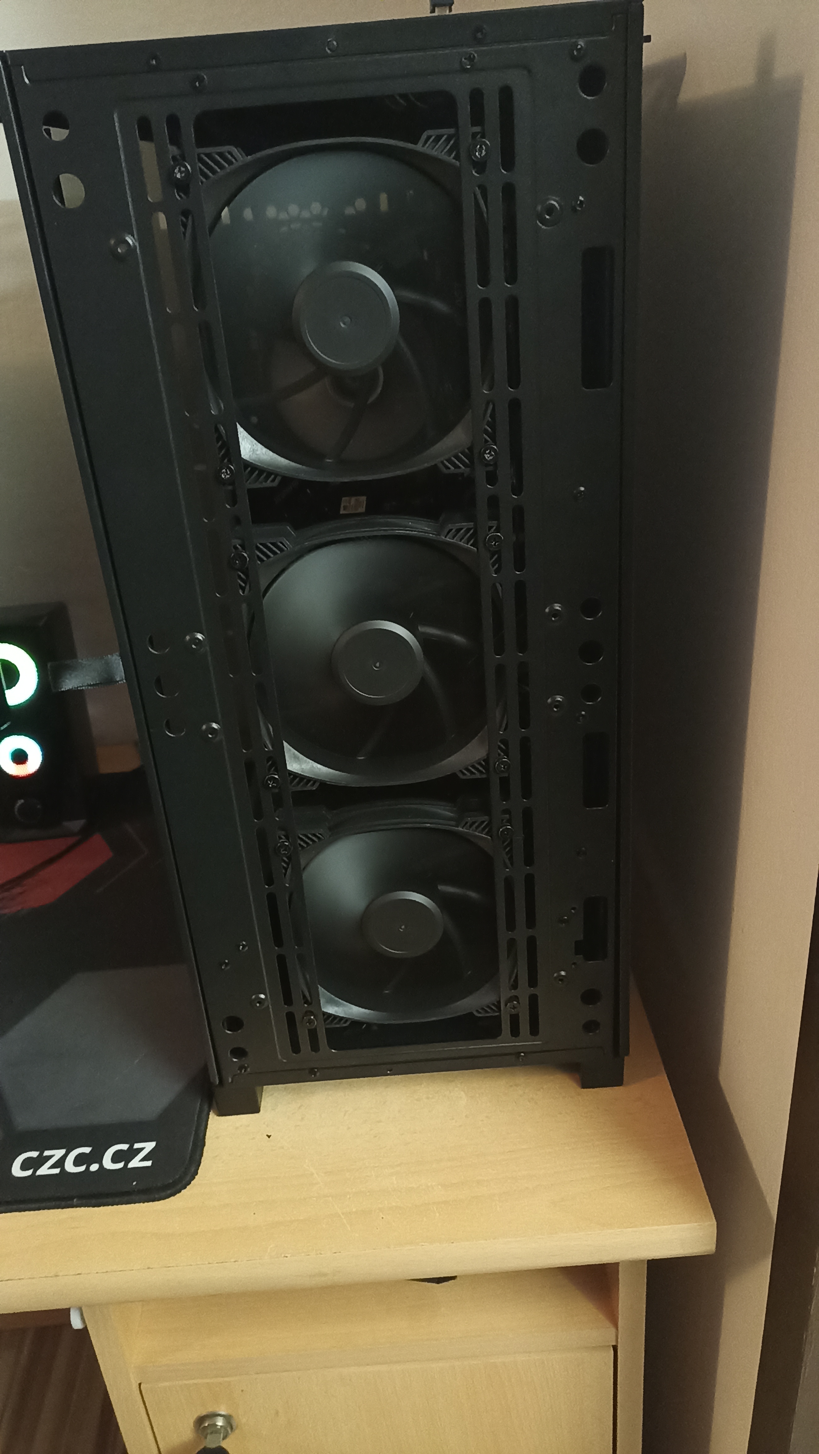 Ventilatory predpokladam funguji spravne - tzn ty predni tri foukaji dovnitr, na cpu foukaji k zadni stene a ten na zadni stene ven.