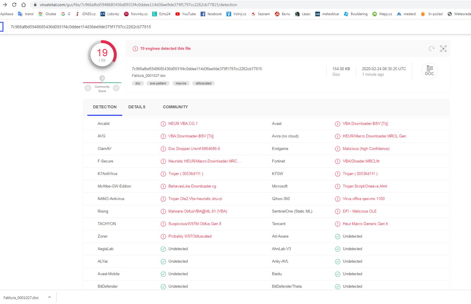 Ahoj, omylem jsem otevřel *doc z emailu, pod záminkou že je to faktura za telefon. Následně mi všechny záložky chrome, vyhodily chybu. Soubor jsem nechal otestovat na totalvirus.com. Print screen vložím