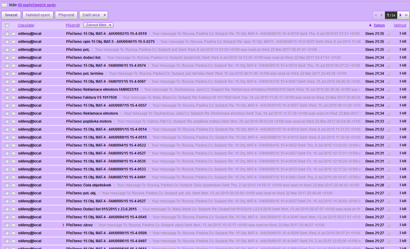A nyní se chránka zahltila emailama sdileny@local v předmětu je u všech uvedeno to, co jsme již někdy někomu posílali- potvrzení termínu, závoz, poptávky, nebo to je pouze oznámení o přečtení zprávy z druhé strany.