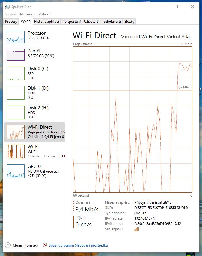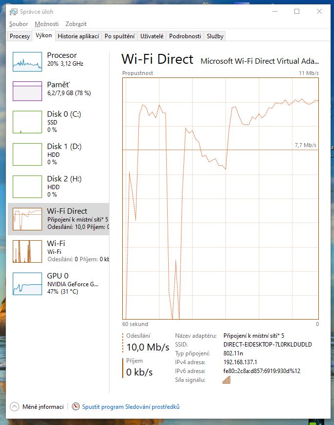 Zkoušel jsem bezdrátově pouštět filmy z PC do TV ale je to velmi nestabilní. Asi mně nestíhá wifi v PC nebo nevím. Nepřipojí se to k pc pokaždé - někdy až napotřetí a pak při puštění filmu a přetáhnutí do TV ve správci úloh na PC jsem měl Wifi direct vysoce přes čáru, která je 7,7 Mb/s. Skákalo to až k 16 Mb/s, což způsobovalo brutální trhání. Wifi v PC mám přes USB Tenda W322U Wireless-N USB Adapter do USB slotu 3.0. Pomohla by jiná wifi?