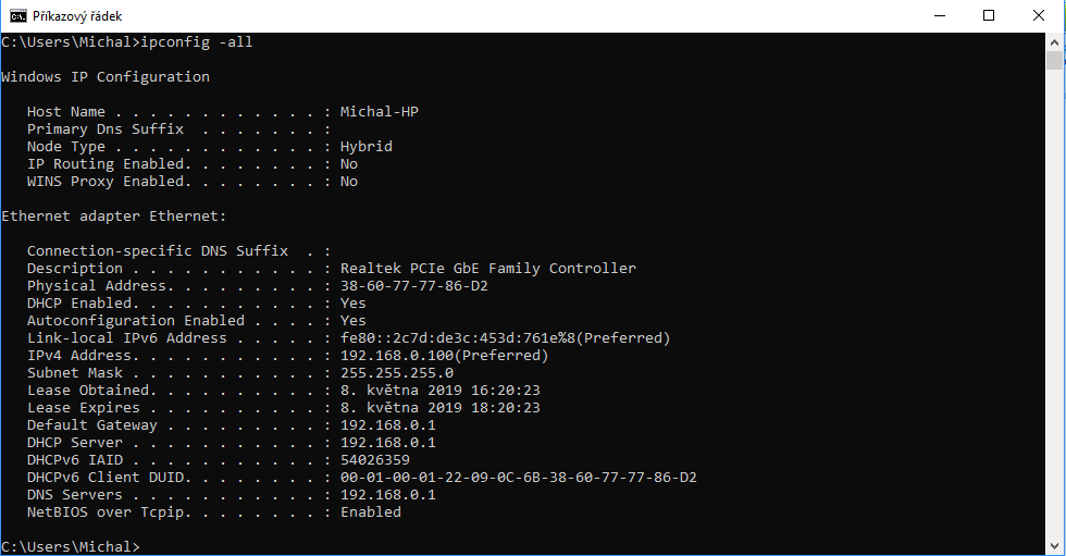 ping: v tomhle případě "ping 192.168.0.1".