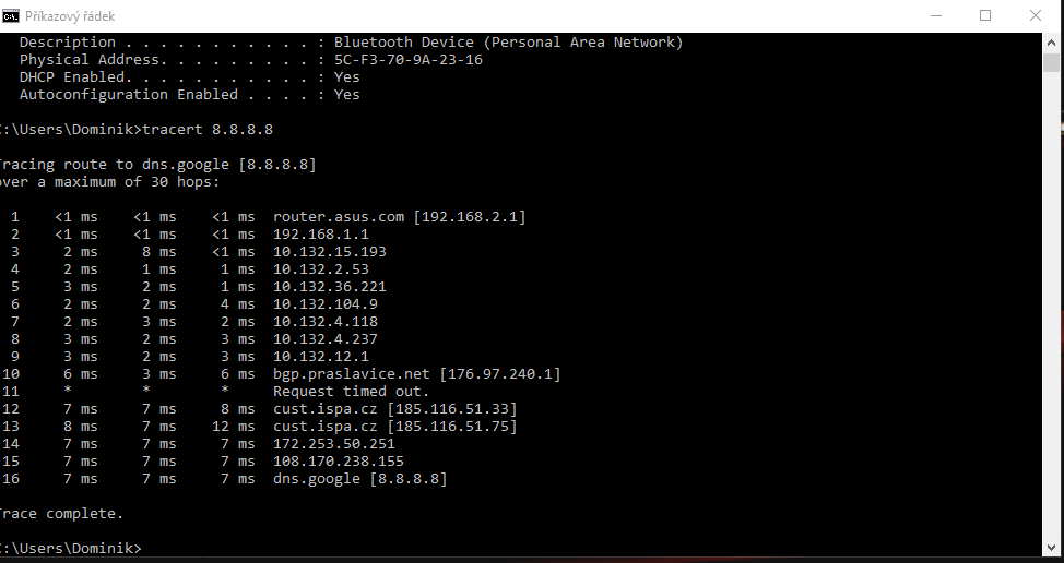 Když nechám vytracovat v cmdčku, tak to jde přes 2 privátní adresy a to 192.168.2.1, což je router, který se má chovat jako router a 192.168.1.1, což absolutně netuším, co by mohlo být, jelikož se do toho nedá ani připojit.