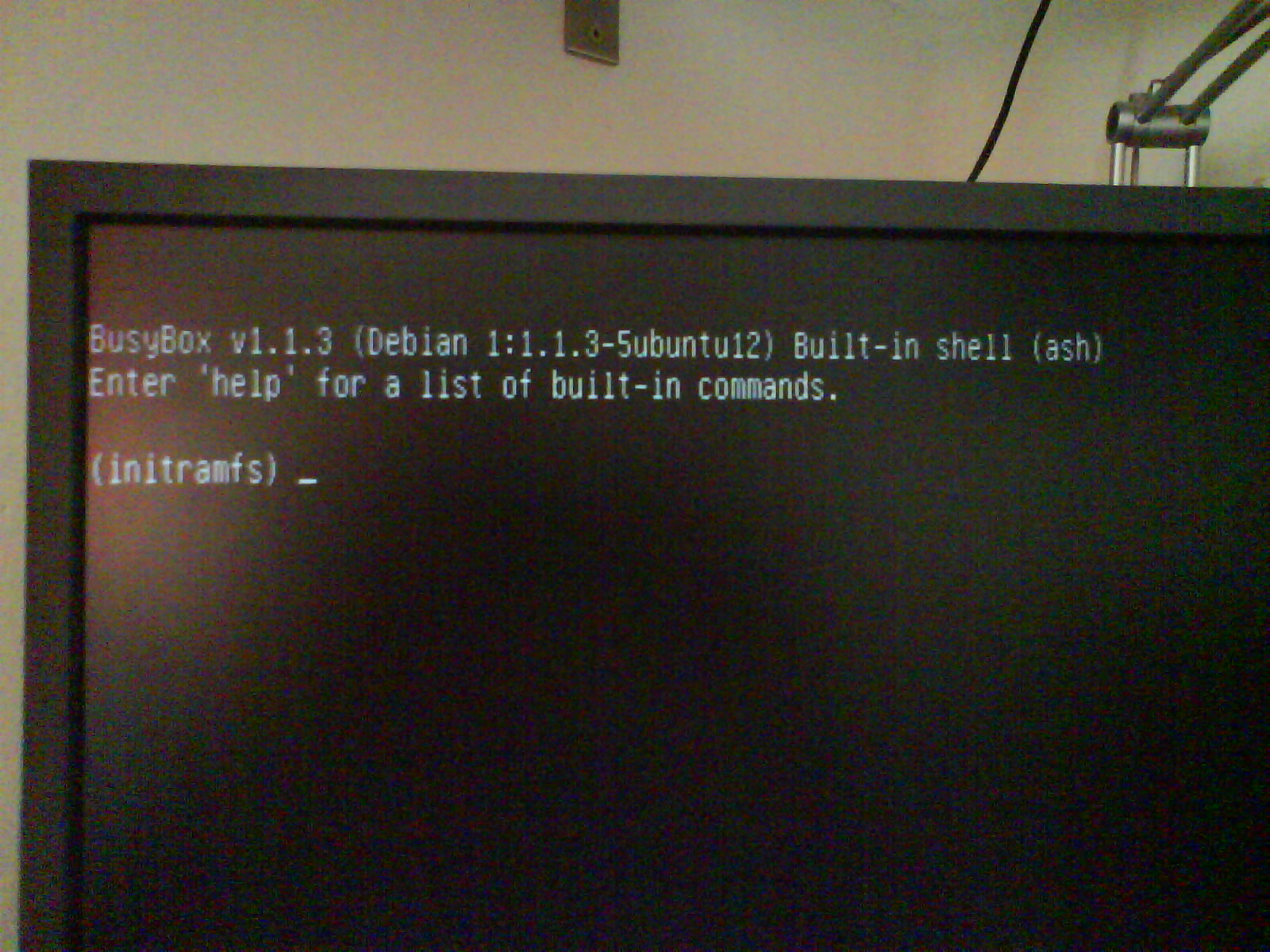 už dlouho jsem se rozhodoval, že si nainstaluji Linux a když se mi s ním bude pracovat dobře a mi fungovat budou programy kvůli škole, tak ně něj přijdu úplně. Konečně přišla ta správná doba. Mám hodně volného místa na diku a dost lidi okolo mě přechází na Linux .... Včera jsem se pokoušel nainstalovat nejnovější verzi Ubunty 8.04 pro AMD 64edit. (nevím jestli by nebyla pro mě nebyla vhodnější verze třeba Fedora). Ale po zdárné instalaci se mi nechce spustit. Když zapnu PC, tak vše naběhne v pořádku (jako u Win) vidím logo Ubnutu a dole mi běhá pole s načítáním, ale pak mi to spadne na černou obrazovku s nápisem viz. foto. Prosím poraďte kde jsme udělal chybu a jak dokončit instalaci abych mohl používat Ubnutu.