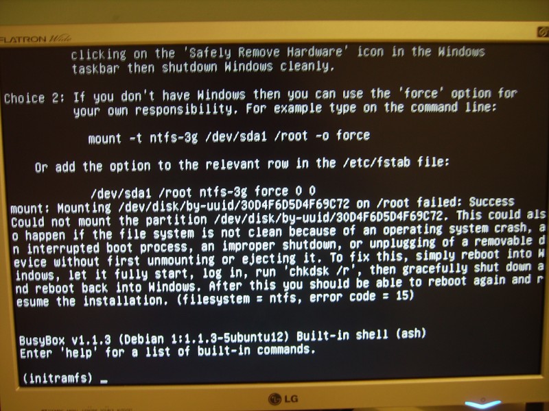 Ta hláška, co se ti objevuje říká, že nějaký NTFS disk je "poškozený", prostě není bezpečný pro připojení a používání .. proto nebyl připojen. Můžeš ho připojit natvrdo, ale nedoporučuje se to, i když já to udělal už několikrát a nestalo se mi nic. A předpokládám, že právě na tom oddílu je i Ubuntu/Kubuntu, když jsi to instalovat z widlí..