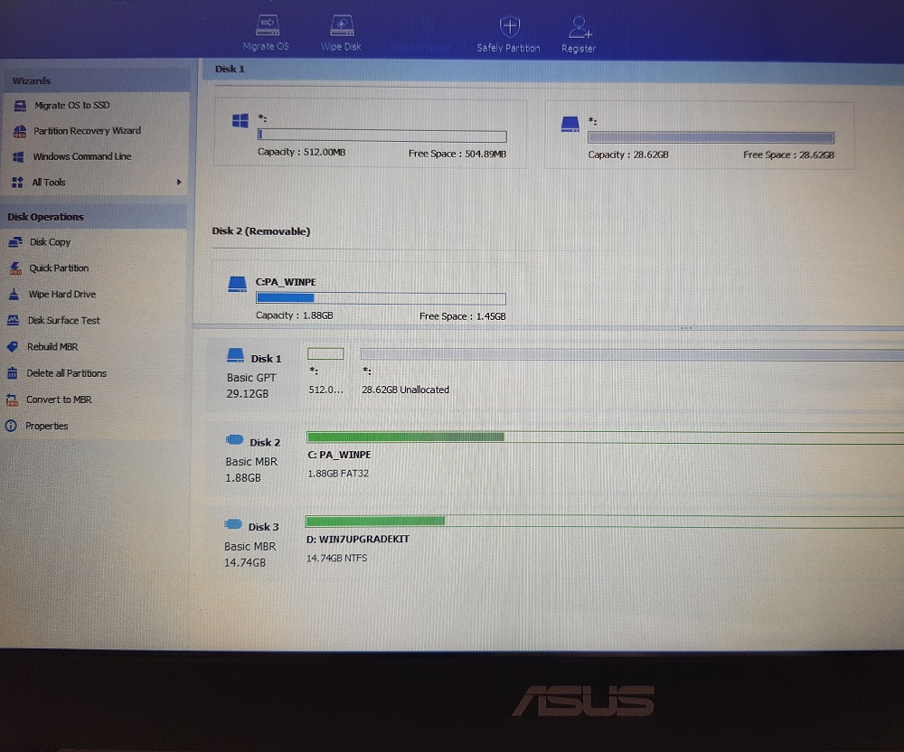 Klik PTM na označenie Disk 1 a vyber si Delete all Partitions a potom hore vľavo na potvrdenie Apply.Ten disk 32GB , no veľa voľného miesta tam nebudeš mať.